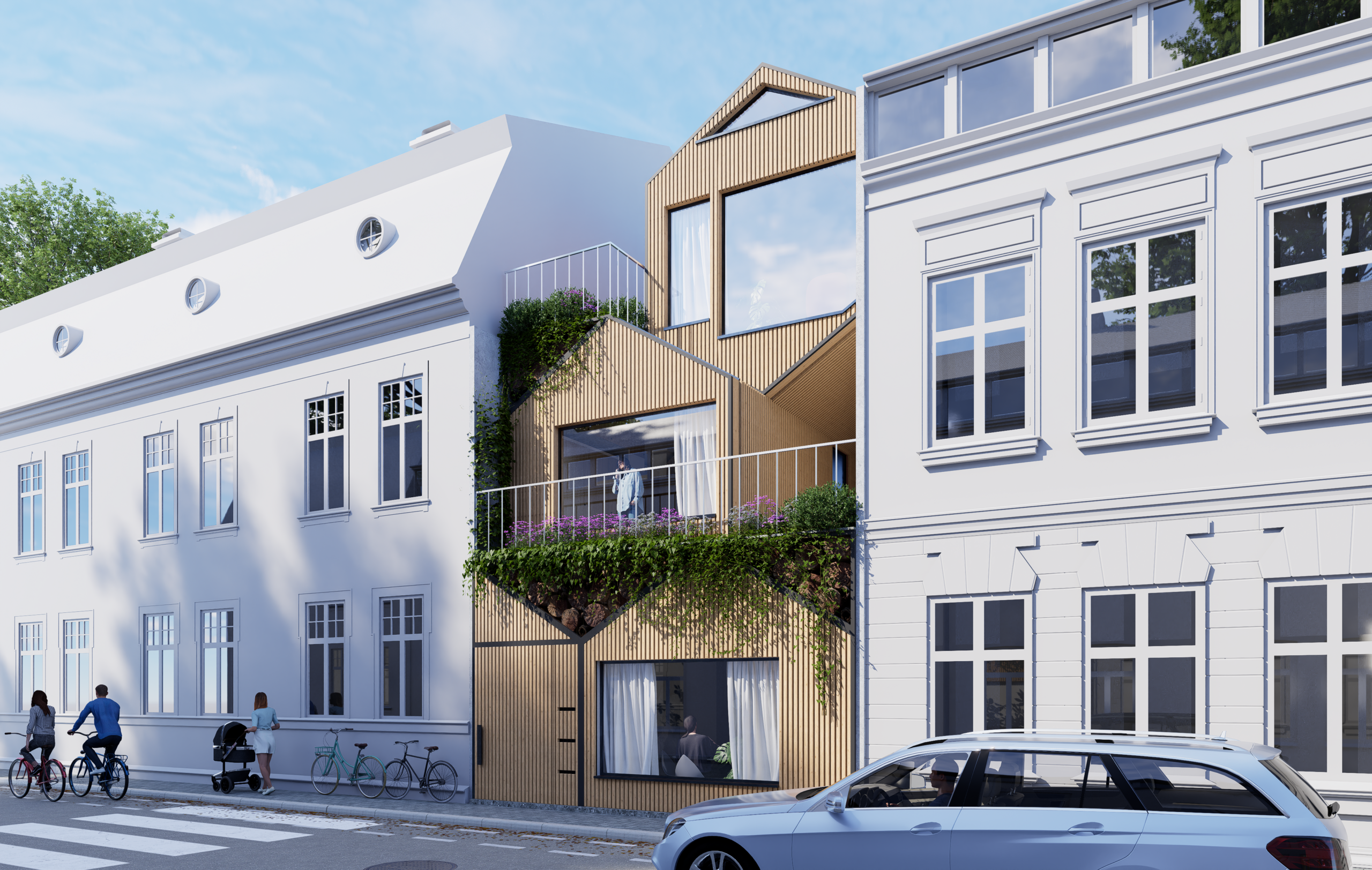 Groene gevels, natuurlijke materialen en slimme volumes brengen zuurstof in het straatbeeld. Ze versterken biodiversiteit, verzachten harde lijnen en creëren een warmere, gezondere leefomgeving.